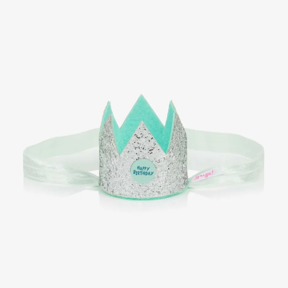 Girls silver glitter crown headband by Souza, with a cute green Happy Birthday appliqué. Made in soft and lightweight felt, it has a mint green lining and a matching elasticated strap that fastens under the chin.