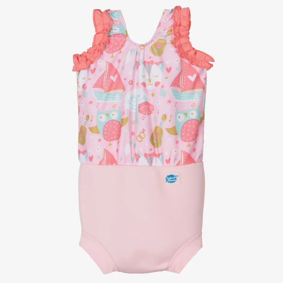 An adorable pink swimsuit for little girls by Splash About, made in silky smooth and stretchy fabric on the upper body with UPF 50+. Poem-inspired, it has a cute Owl & The Pussycat print on the top and contrast pink ruffle trims on the wide shoulder straps. Easy to pull on, the built-in swim nappy on the lower body is made from soft and supple neoprene and fits securely on the waist and thighs to minimise the risk of leaks. It can be worn alone or with the brand's liners for extra protection and ease of cleaning.