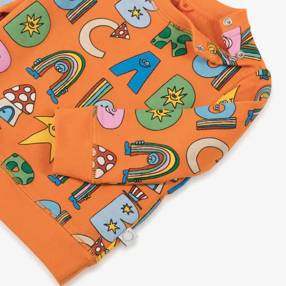 Orange sweatshirt for little boys by Stella McCartney Kids, made in soft, mid-weight organic cotton jersey. It is patterned with fun, colourful letters spelling out the magical word 'Abracadabra'. It has cosy ribbed trims and popper fastenings on one shoulder to help with dressing.