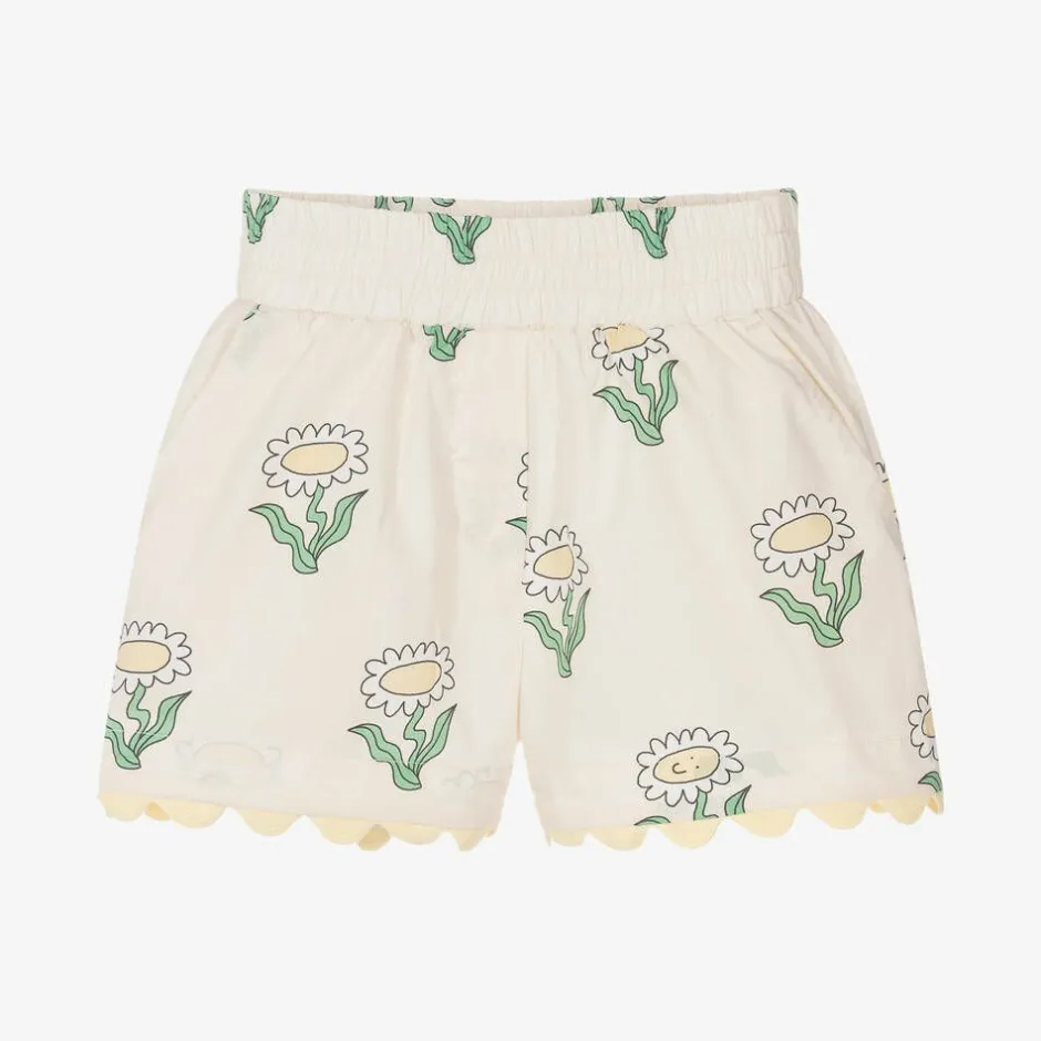 Ivory shorts for girls by Stella McCartney Kids, made in soft, smooth organic cotton poplin. These fun shorts have a pretty daisy print and yellow scalloped edging on the legs. They have slanted front pockets, patch pockets on the back and an elasticated waist for a comfortable fit.