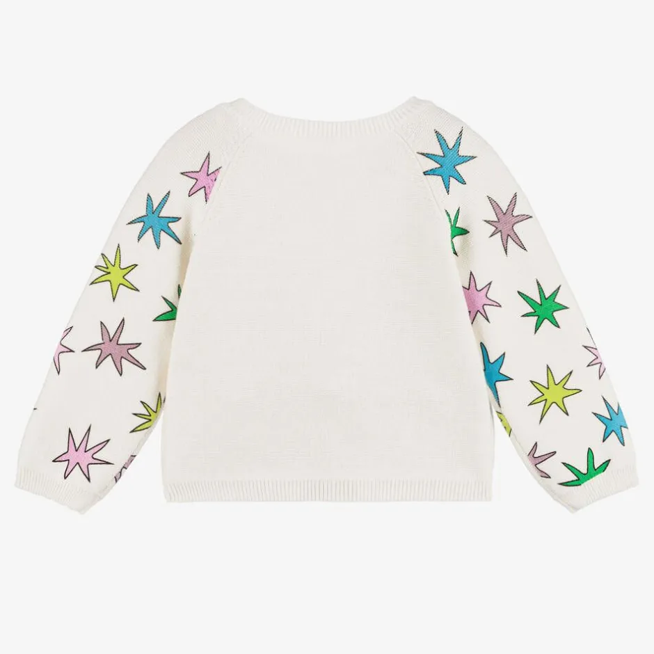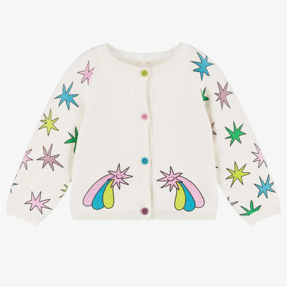An ivory knitted cardigan for younger girls by Stella McCartney Kids, with fun shooting star characters on the front. An ideal layering piece, this playful design has colourful stars printed on the long sleeves and matching, branded button fastenings on the front. It is made in soft, organic cotton with neat, ribbed trims. The Stella McCartney fit can be quite small so choose a size up if you want room to grow.