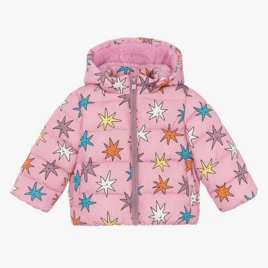 A pink puffer jacket for younger girls by Stella McCartney Kids, made in recycled fabric with mid-weight padding. Ideal for those colder days, it is lined in beautifully soft fleece for additional warmth and patterned with colourful star characters for a fun and playful look. The cosy hood can be easily detached for an alternative look and it has useful pockets and a zip fastening on the front. The Stella McCartney fit can be quite small so choose a size up if you want room to grow.