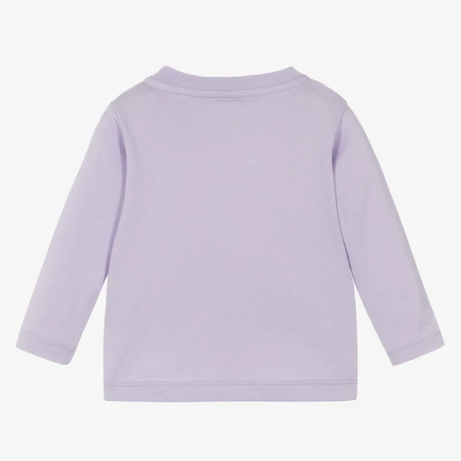 A lilac purple long-sleeved top for younger girls by Stella McCartney Kids, made in soft organic cotton jersey. Great for comfortable casual wear, this fun top has a cute star character logo print on the front in green, pink and blue. It is simply styled with a lightly ribbed crew neckline and has poppers on one shoulder to help with dressing. The Stella McCartney fit can be quite small so choose a size up if you want room to grow.