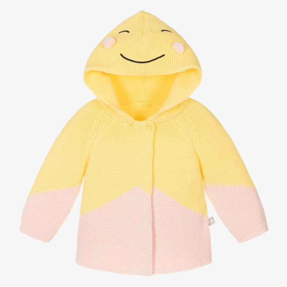 Adorable yellow and pink cardigan for little girls by Stella McCartney Kids, knitted in soft organic cotton. Lovely for layering, it has simple button fastenings on the front and a useful, cosy hood with a embroidered happy face and blushed pink cheeks. The Stella McCartney fit can be quite small so choose a size up if you want room to grow.