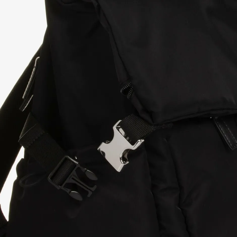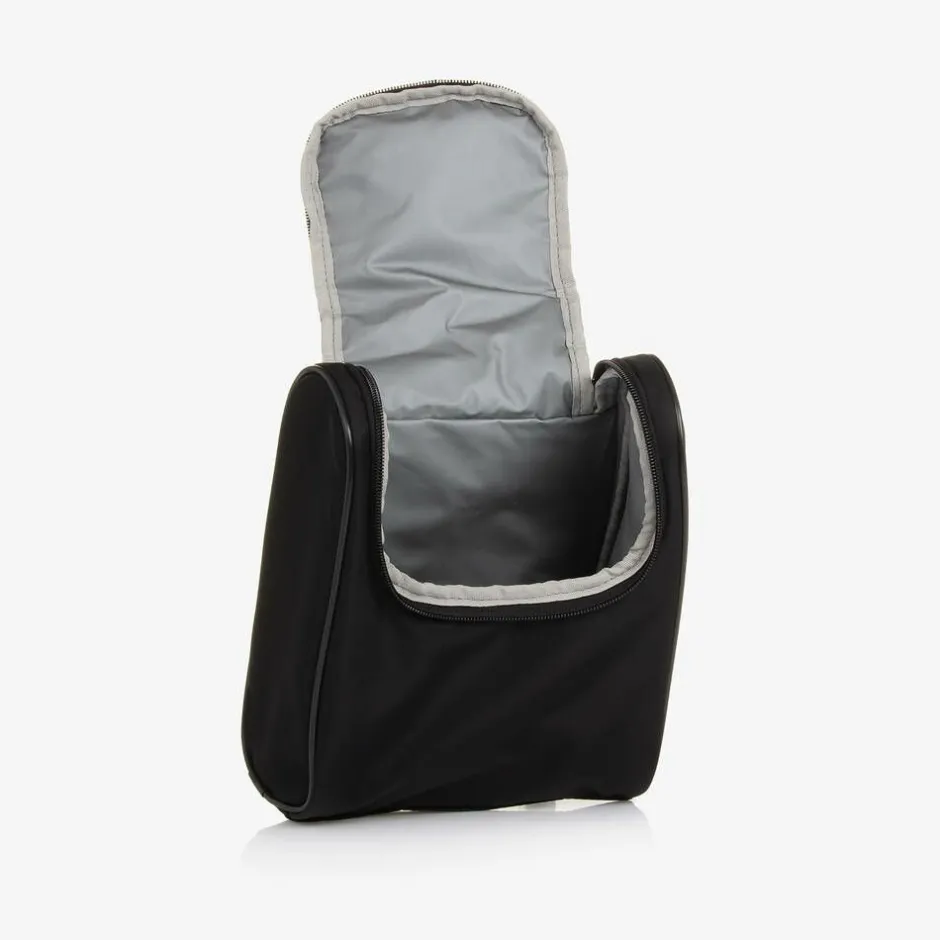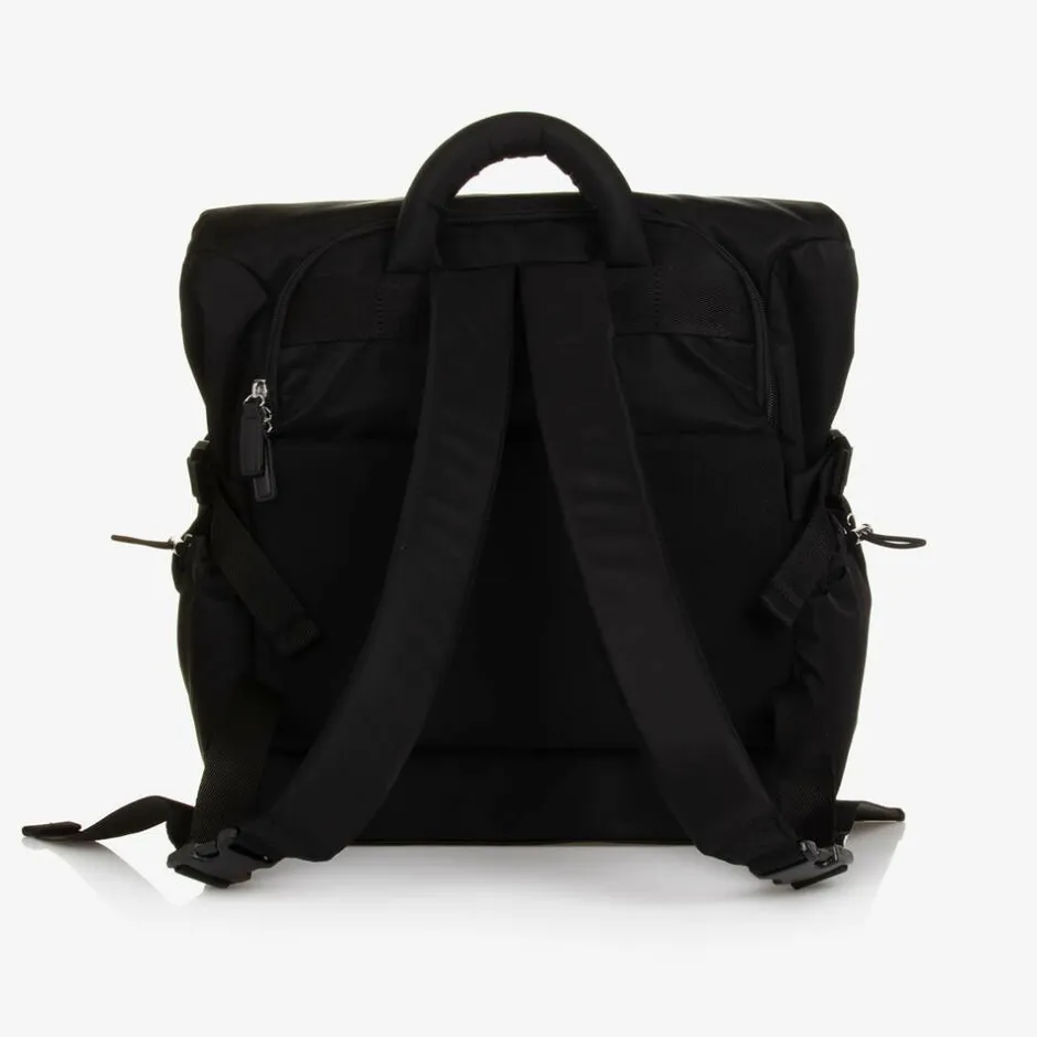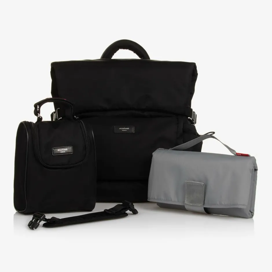 Practical black changing bag by Storksak, ergonomically designed with padded back and shoulder support. Smooth and water repellent, it is made from recycled nylon with silver-tone hardware. The large main compartment is easily accessible with zips from the top and the back. It has multiple internal pockets for easy organisation with an external zip pocket and two side pockets secured with toggles. It is easily converted from a backpack to a shoulder bag with a detachable strap and can be carried securely on a wheeled suitcase when travelling. It comes with an insulated bottle bag and a washable changing, each with velcro fastening carry straps.