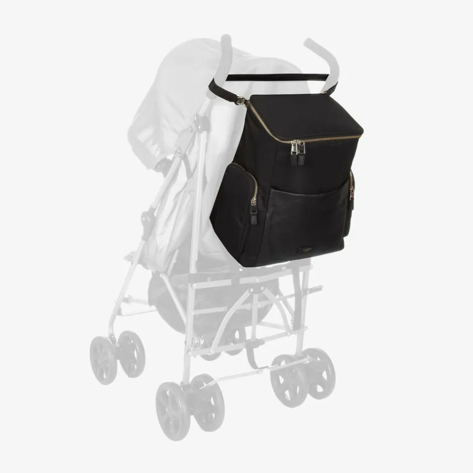 Practical black changing bag by Storksak, with stylish gold accents and grained leather trims. The spacious main compartment fastens with a smooth zip, and contains elasticated and zip pouches for extra organisation. It comes with an easy-to-clean changing mat and useful bottle bag, each with velcro fastening carry straps. There are zip-fastening pouches on the sides and a slip, popper-fastening pocket on the front and back for smaller essentials. The adjustable, shoulder straps can transform into stroller straps, via the gold clip fastening on the back. A gold embossed logo can be seen on the front, completing this accessory with a branded touch.