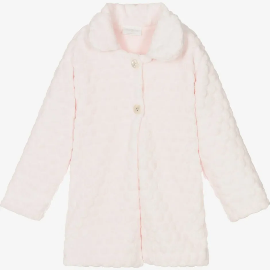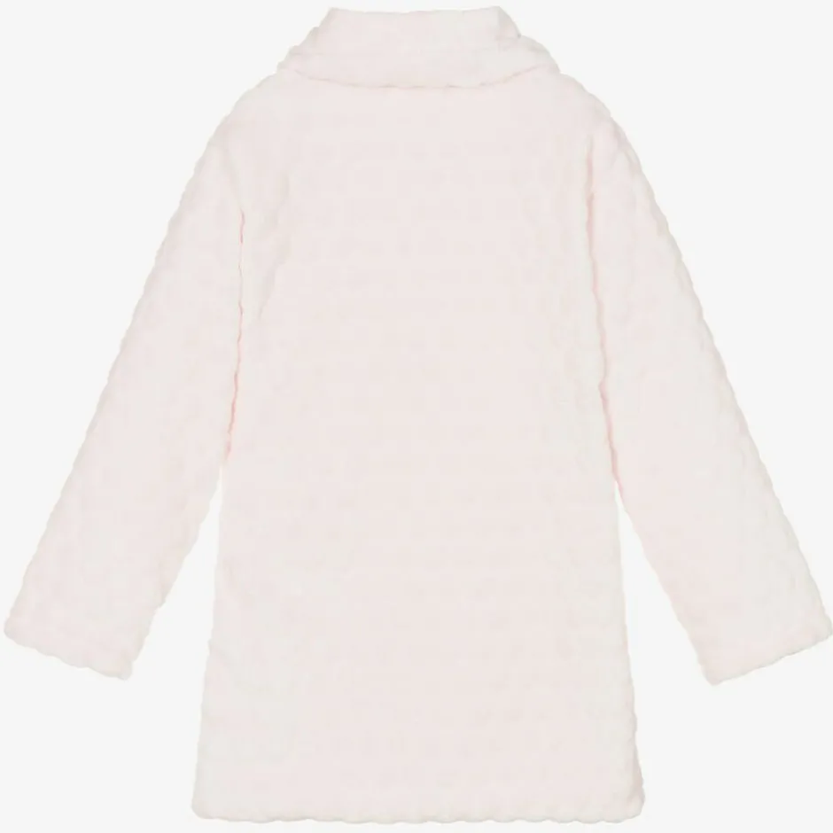 Cosy and comfortable, pale pink dressing gown for girls by Italian designer Story Loris. Made in luxuriously soft plush fleece, it has a delicate raised dotted pattern and a classic rounded collar. The body is lined in cotton jersey for breathability, and there are pearlised buttons to secure down the front.