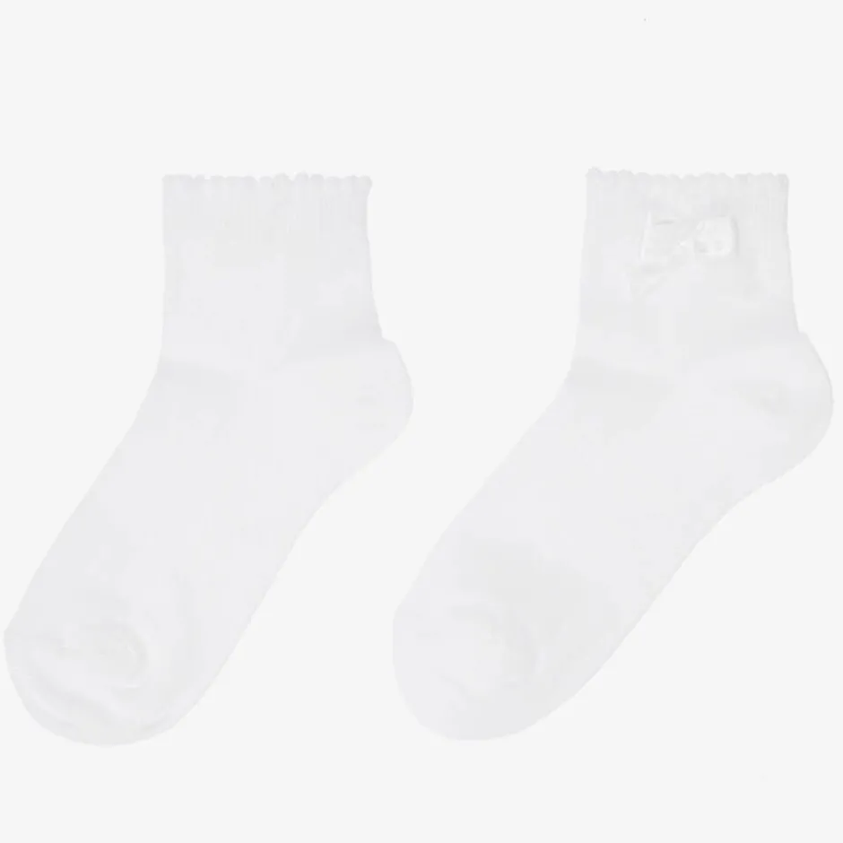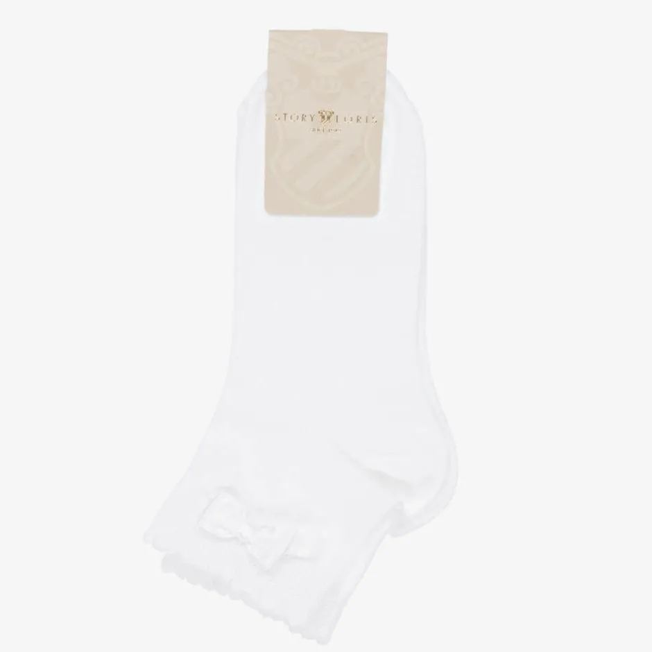 Little girls white socks by Story Loris. Finely knitted in soft cotton, these cute scallop-edged socks are decorated with a silky bow.