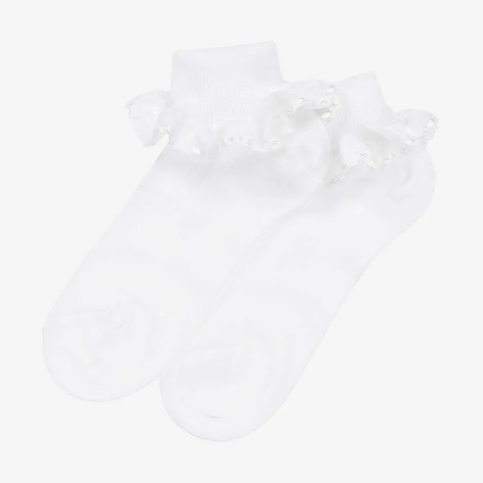 Girls white cotton socks with ribbon ruffles by Story Loris. Finely woven in soft cotton, these pretty socks have delicate organza and white ribbon ruffle trims at the ankles.