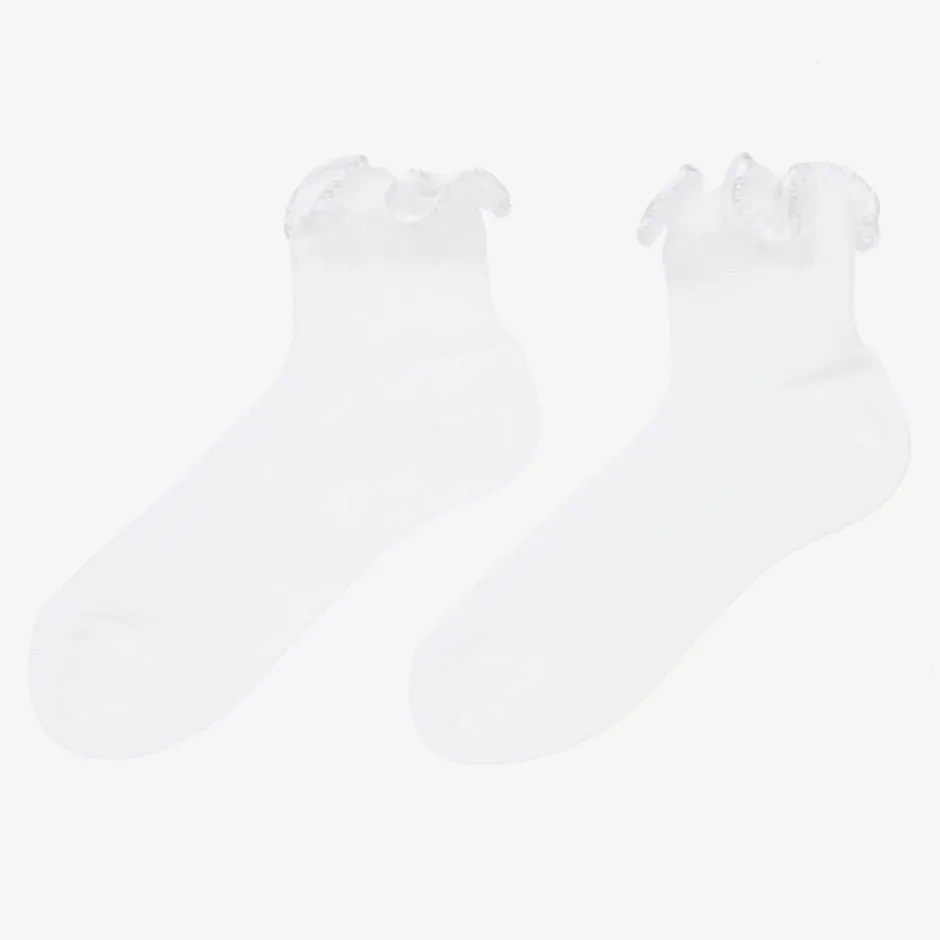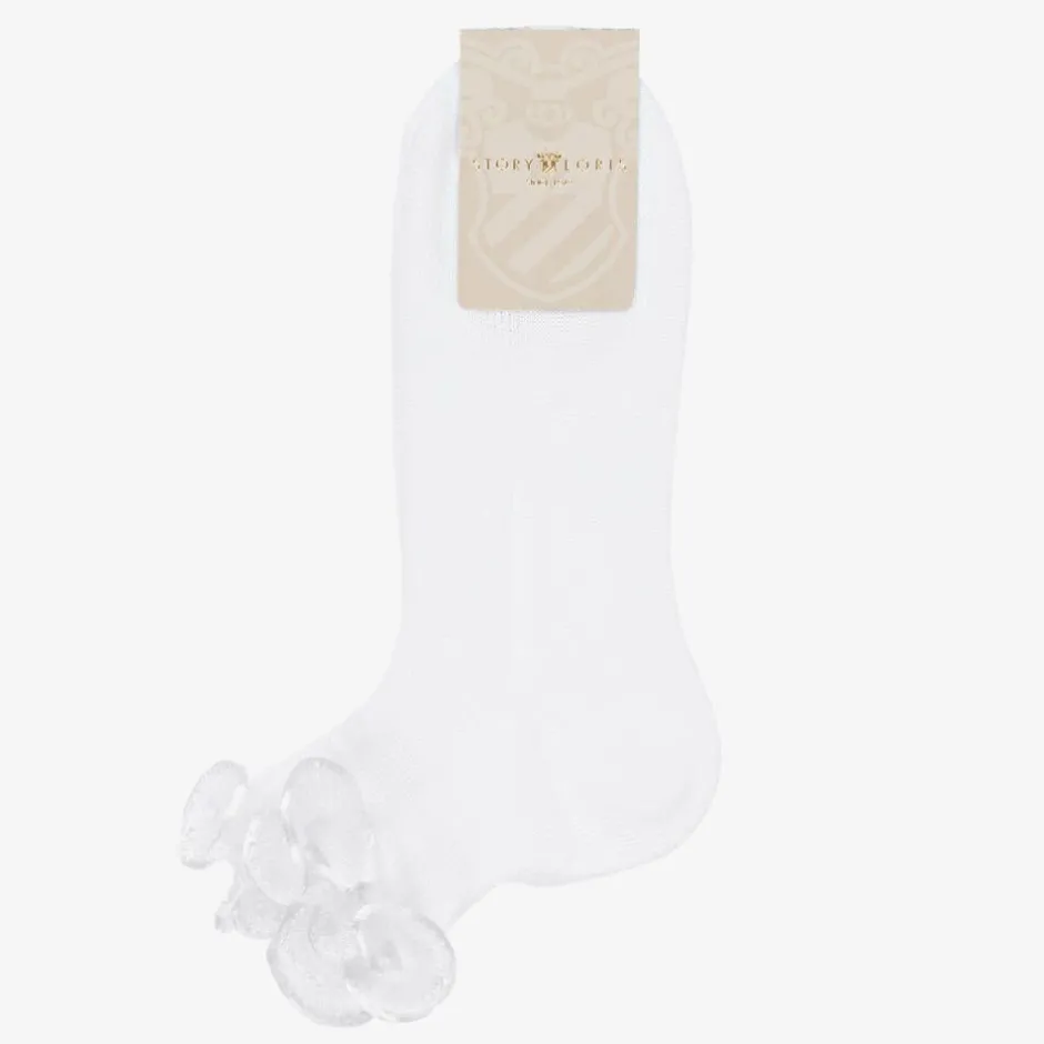 Little girls white socks by Story Loris. Finely knitted in soft cotton, there are ruffles on the ankles, trimmed with white satin edging.