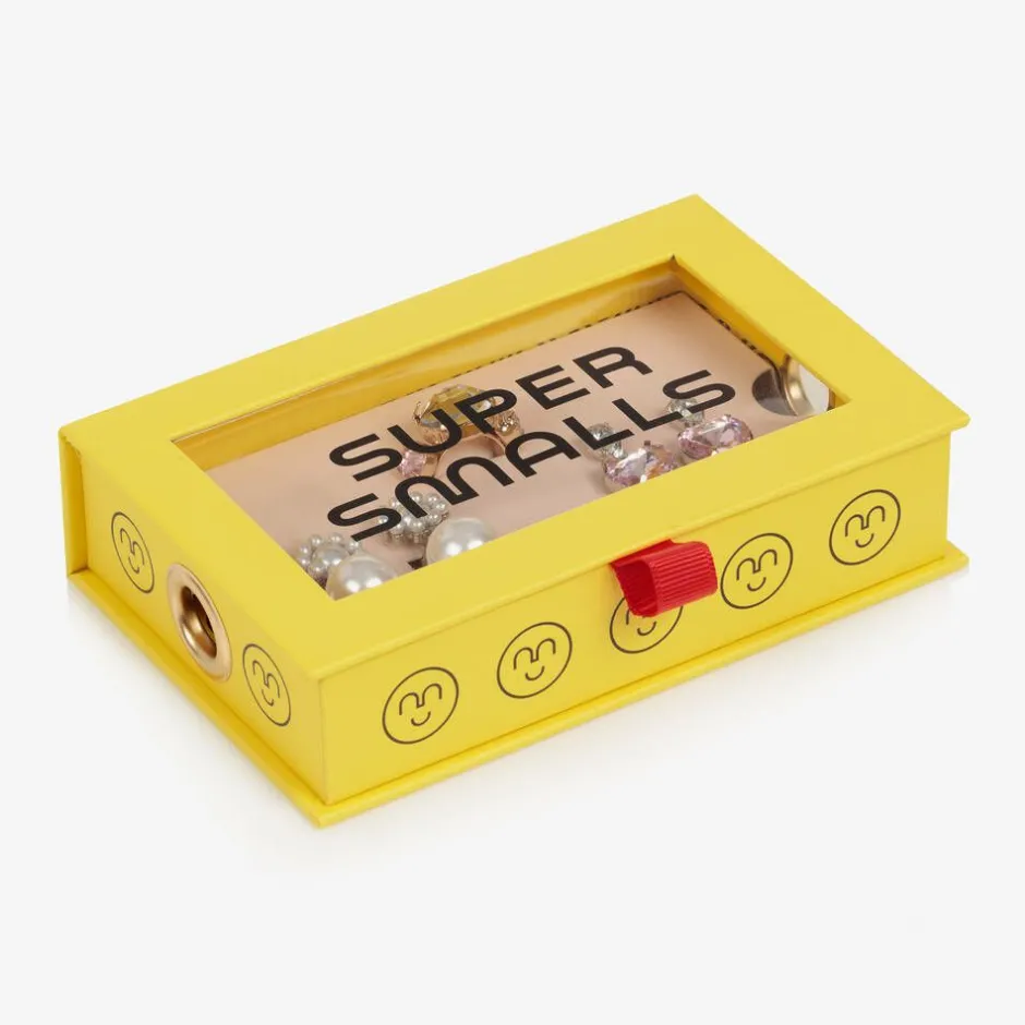 A lovely set of two earrings and a ring for girls, by fun accessory brand, Super Smalls, presented in the signature yellow box. Channelling that elegant look, this pink and white set includes a pair of faux pearl dangling earrings, a pair of jewelled heart earrings and a matching gem ring to complete the look. The clip-on earrings come with removable silicone pads and the ring is adjustable to fit comfortably.