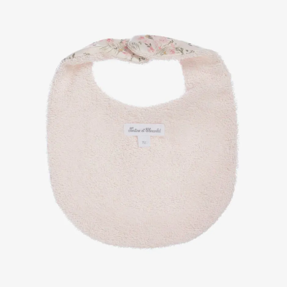 A lovely pale pink cotton bib for baby girls by Tartine et Chocolat. It is woven in fine needlecord and patterned in a beautiful floral print in pink and green, with an embroidered logo on the front. Lined in soft absorbent towelling, it fastens around the neck with a single popper.