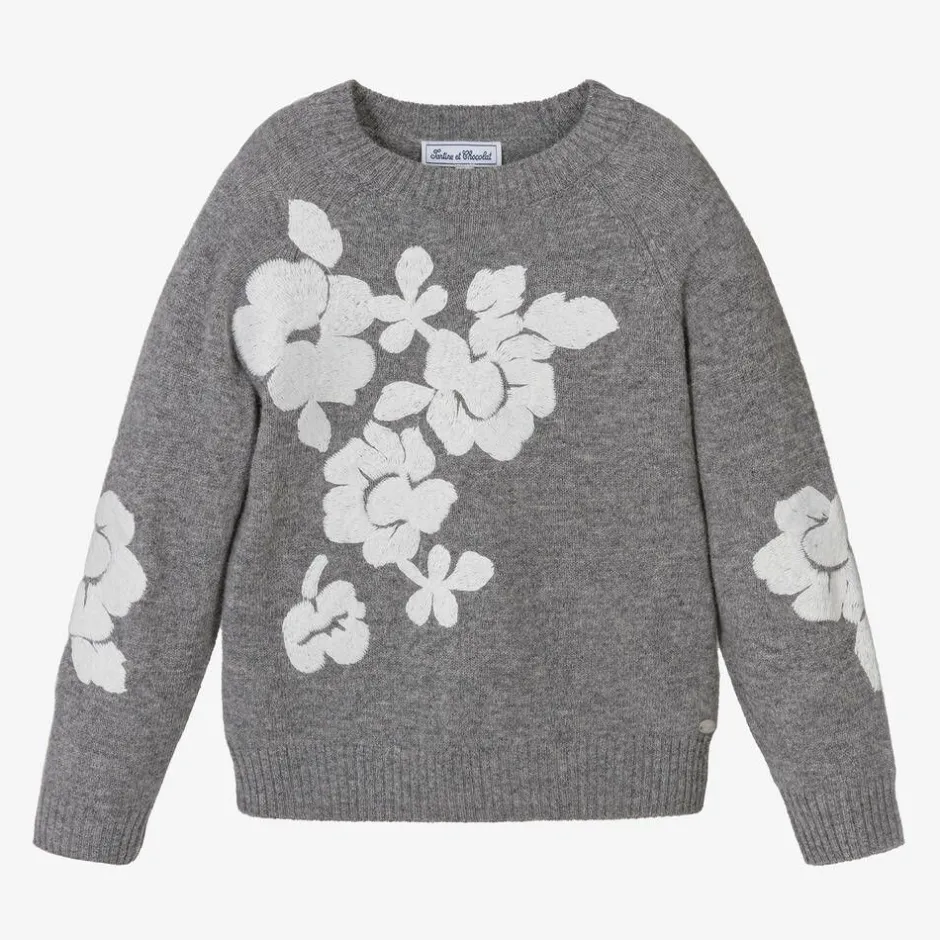 Beautifully soft and cosy for girls, this grey jumper from French label Tartine et Chocolat is knitted in soft wool. Ivory embroidered flowers on the front and cuffs add a stand-out look to this long-sleeved style. Designed in a relaxed fit with raglan sleeves and classic ribbed trims, it has a pearlised logo tab on the front hem to complete the designer look.