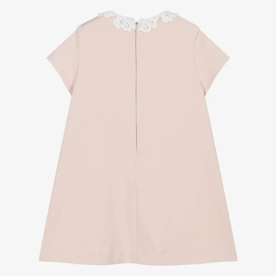 Sweet pale pink dress for little girls by French brand Tartine et Chocolat, with a white lace collar. Made in a soft viscose blend, it is gently gathered below the bib front and has a silver logo charm sewn by the hemline. The dress is lined in lightweight voile for comfort and fastens with a neat, concealed zip on the back.