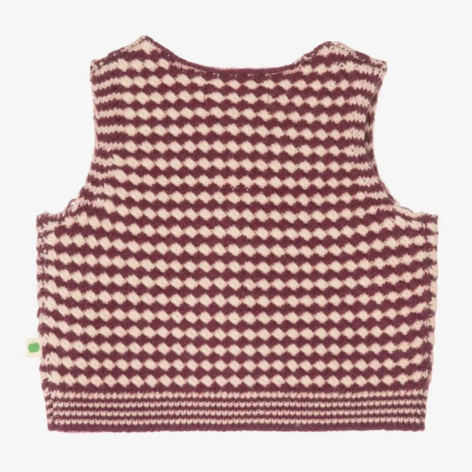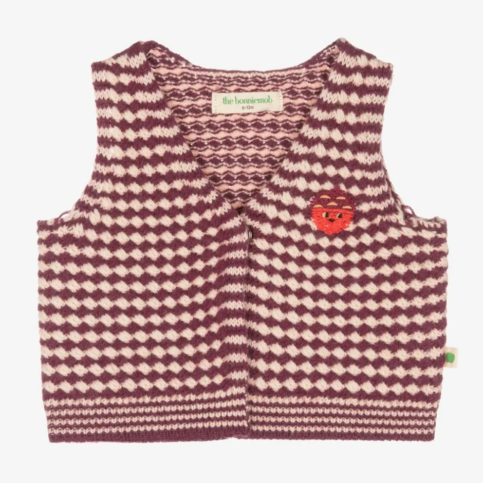 Red and beige checked waistcoat for baby boys and girls by British brand, the bonniemob. Knitted in a mid-weight blend of recycled wool and organic cotton, it has a cute red and orange smiling acorn embroidered on the chest. It fastens with popper on the front and the designer's signature apple logo is on one side seam.