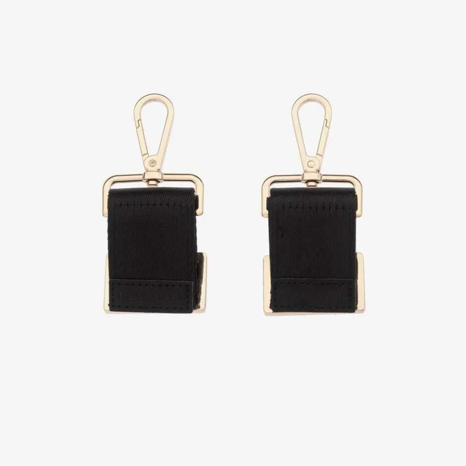 A pair of black pram clips by TIBA + MARL, with shiny gold metal hardware and logo-embossed faux leather trims. These practical accessories easily clip onto your changing bag and attach securely to the baby stroller or buggy with heavy-duty velcro fastening. Adjustable to suit different buggy handles, the straps are made in durable canvas.