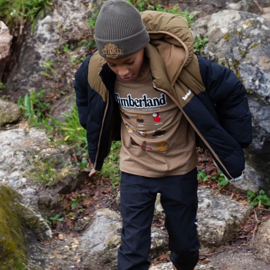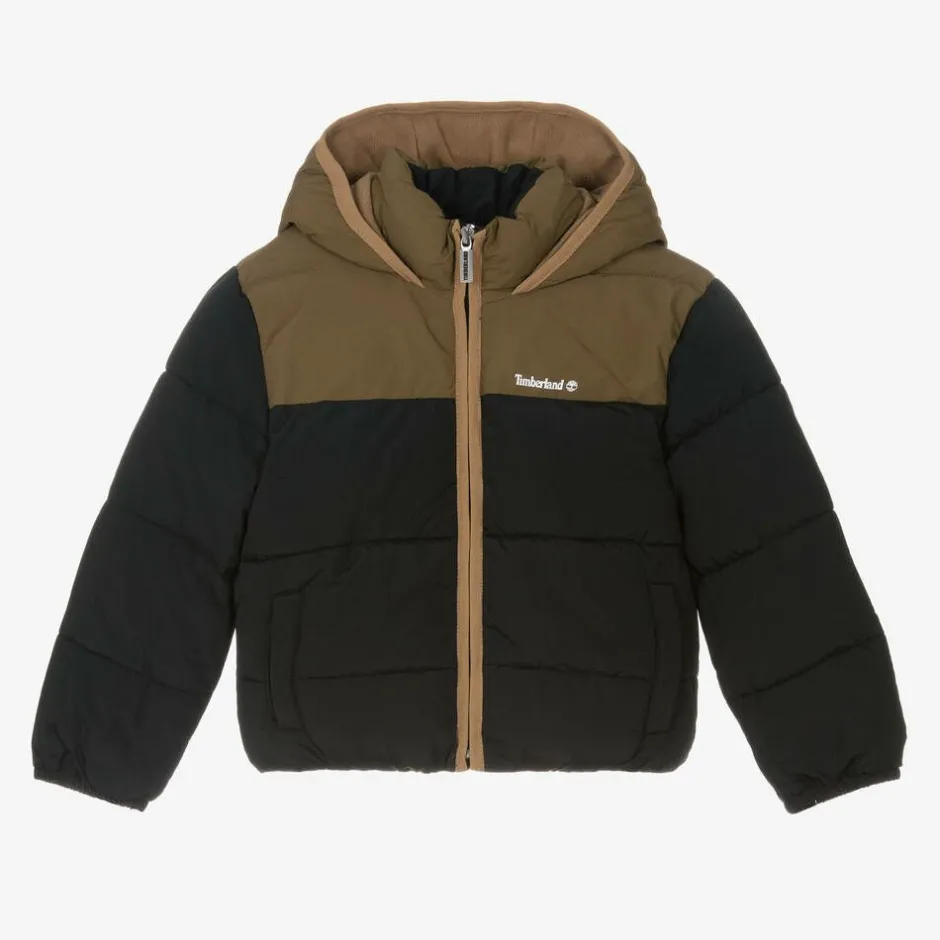 Black and khaki green puffer jacket for boys by Timberland, stamped with the signature tree logo on the chest in white. It has super soft, warm padding, making it ideal for colder days. The hood and front pockets are lined in fleece for extra cosiness. It fastens smoothly with a branded zip on the front. This item contains a minimum of 70% recycled material.