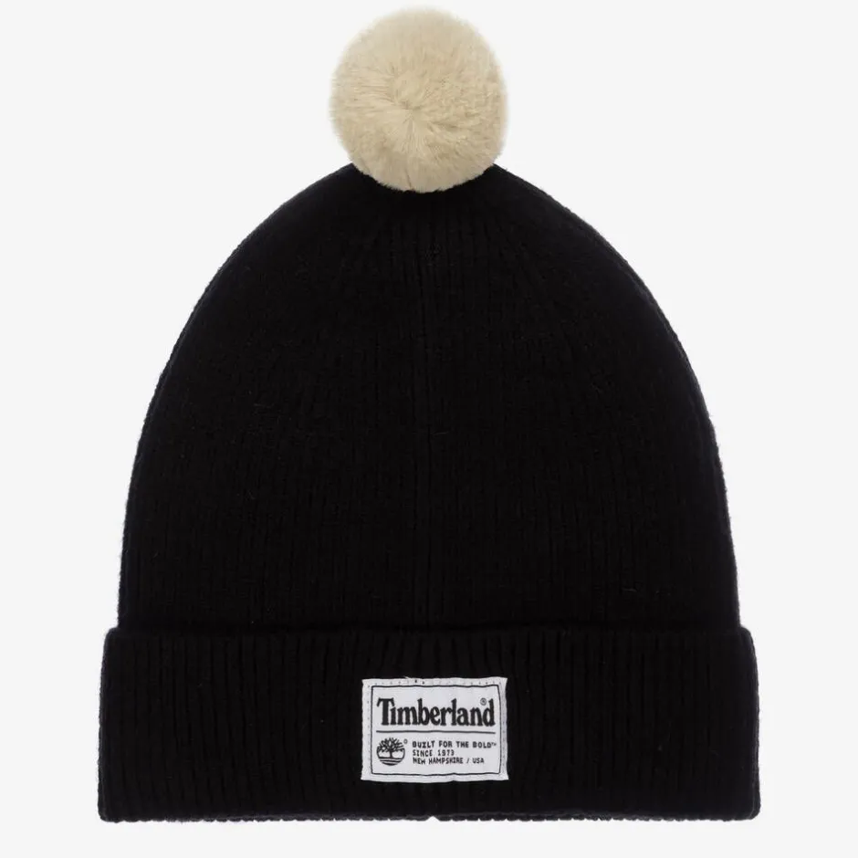 Black ribbed beanie hat for boys by Timberland, knitted in a super soft viscose blend. Ideal for keeping warm on colder days, this simple accessory has a branded badge on the front and a fluffy pom-pom on the top.
