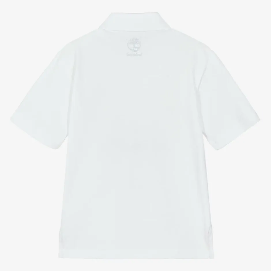 White short-sleeved polo shirt for boys by American brand Timberland, with the signature tree logo printed on the front in yellow. Made in soft organic cotton piqué, it has a ribbed collar, branded button fastenings on the placket, and vented side seams.