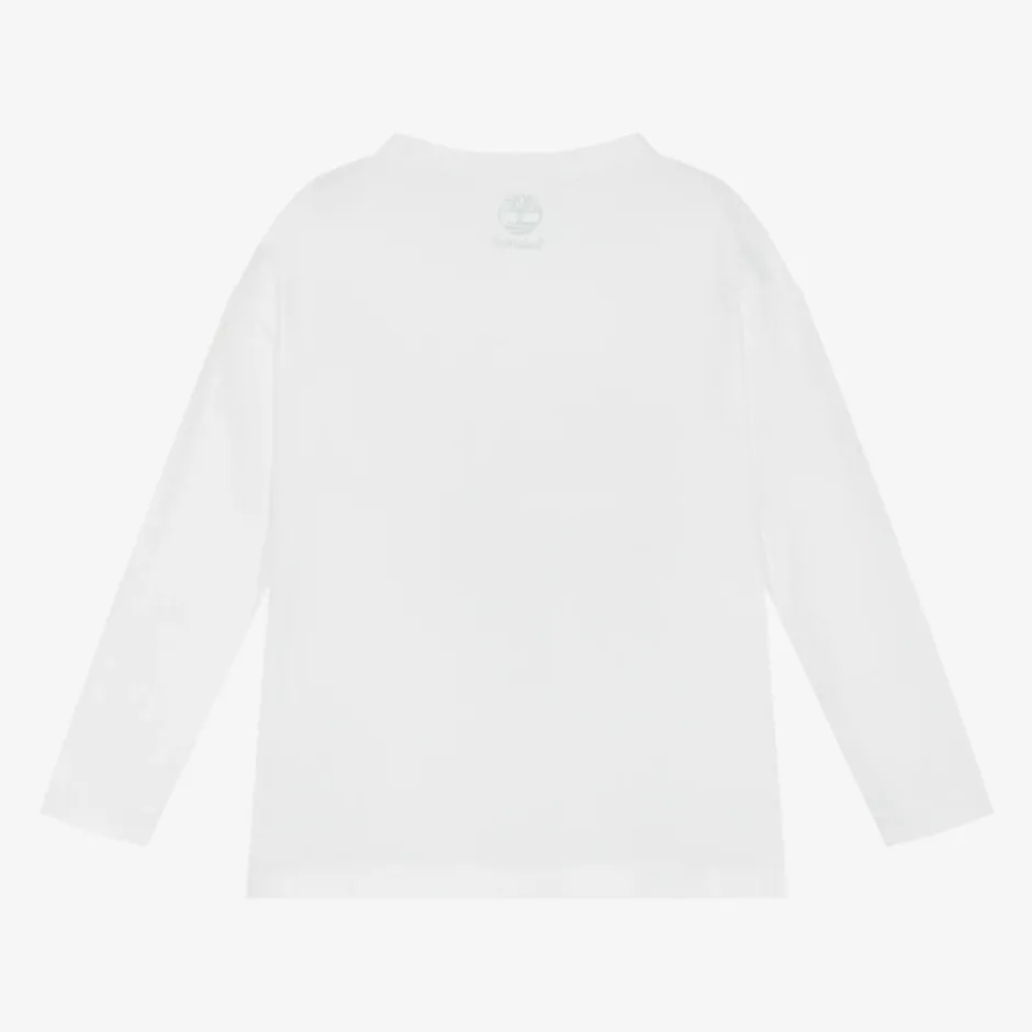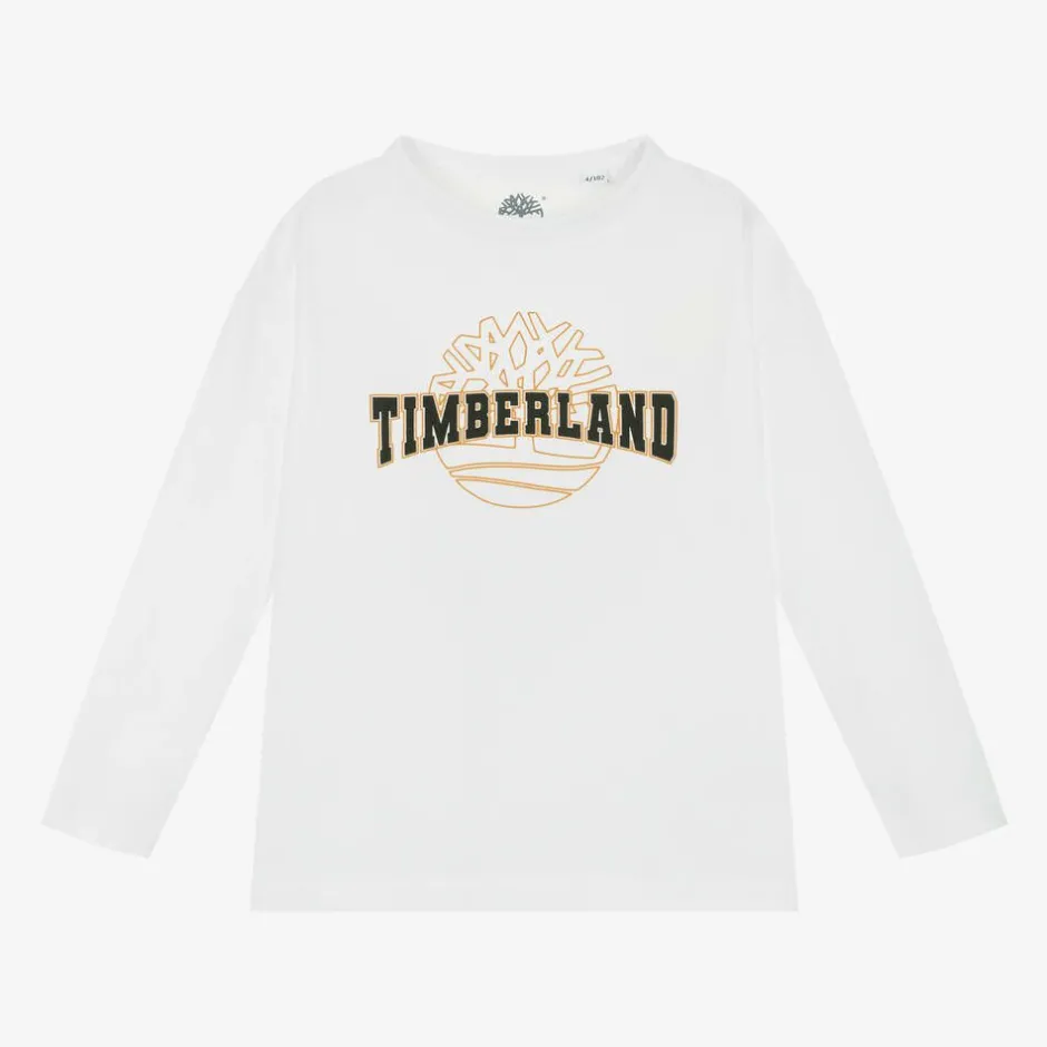 White long-sleeved top for boys by Timberland, made in soft organic cotton jersey. Cool and comfortable, this casual top features a rubberised black and gold logo printed on the front along with the brand's iconic tree illustration.