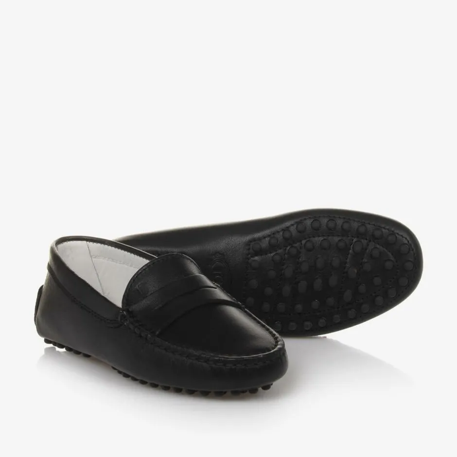 Black Gommino moccasins for boys and girls by luxury Italian brand Tod's. Beautifully handmade in smooth leather, these smart slip on shoes are classically styled with stitched detailing on the toes and a subtle embossed monogram logo on the front. They are lined in smooth leather with leather outer soles detailed with the designer's signature rubberised pebble grips.