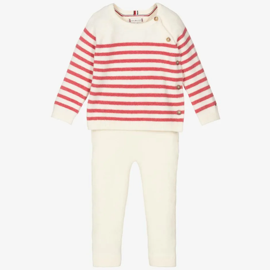 Cosy ivory leggings set for baby girls by Tommy Hilfiger, knitted in a super soft cotton blend. The sweater has pink stripes and button fastenings along one side, whilst the trousers have an elasticated waist and simply pull up. Both pieces are embroidered with the brand's signature flag logo.