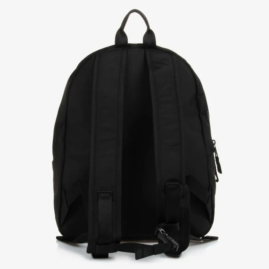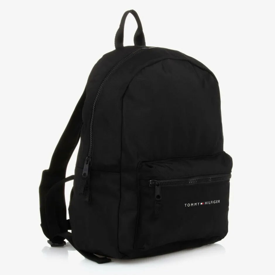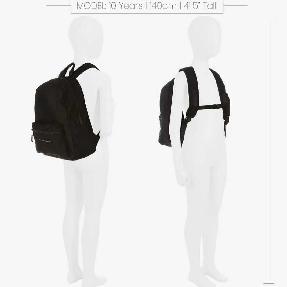 Black backpack for boys and girls by American brand Tommy Hilfiger, made in strong, durable canvas. Comfortable to wear, it has a padded back panel, adjustable, padded shoulder straps, connecting with an adjustable chest strap for extra support, and a useful carry handle on top. There is a zipped pocket on the front, with a white logo and the signature flag motif, and a large main compartment with an elasticated slip pocket. The outer material of this product is made with at least 95% recycled materials.