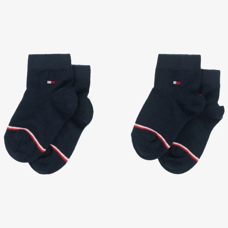 A two-pair pack of navy blue ankle socks for little boys and girls by American brand Tommy Hilfiger. Made in a soft and stretchy cotton-blend, they have navy blue and red striped trim over the toes, with the designer's signature flag logos on the sides.