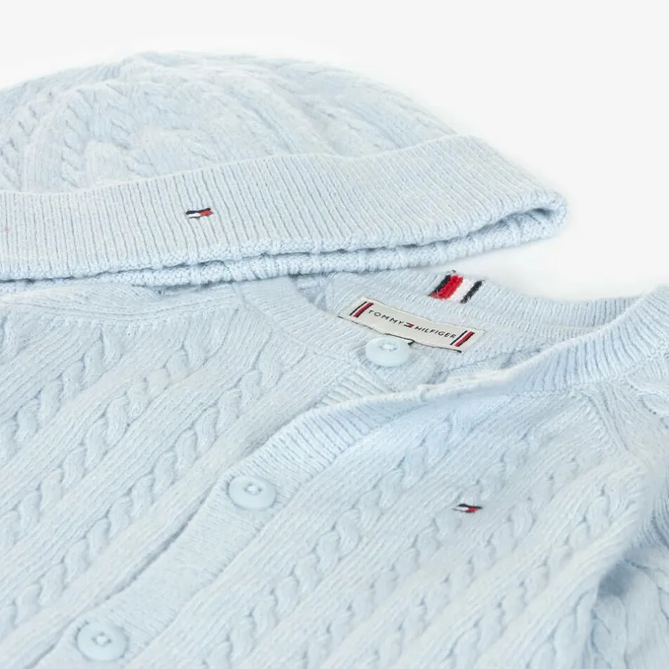 A lovely cable-knit blue trouser set for baby boys and girls by Tommy Hilfiger, presented in a branded gift box. Cosy and comfortable, it is knitted in a beautifully soft cotton and wool blend. The cardigan has button fastenings, the trousers have a gently elasticated waist, and the hat has a sweet turned up brim. Flag logo embroidery and tricolour striped trims add a signature finish.