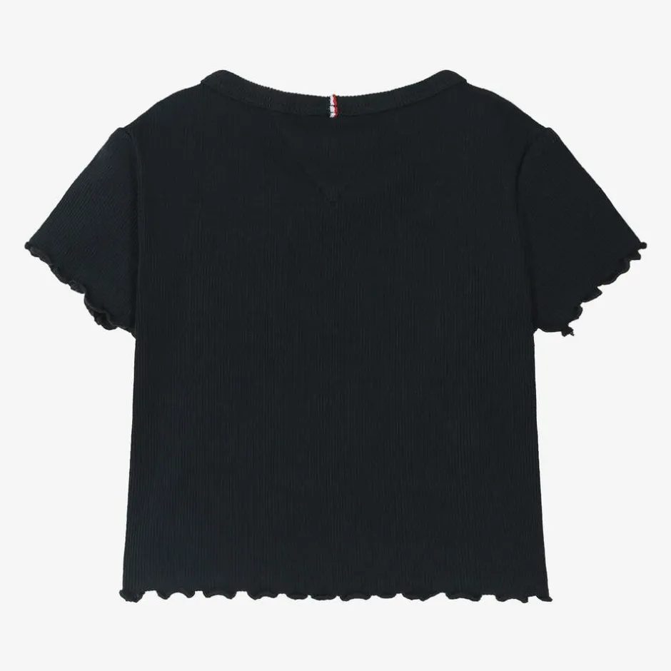 Navy blue T-shirt for girls by American label Tommy Hilfiger, made in soft and stretchy ribbed cotton jersey for comfortable wear. Styled with curled trims on the cuffs and hem, this casual piece has the brand's signature flag logo embroidered on the chest for a subtle designer finish.