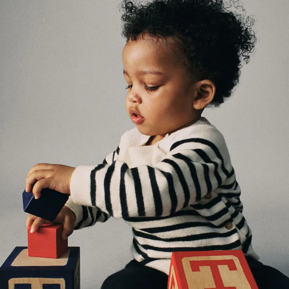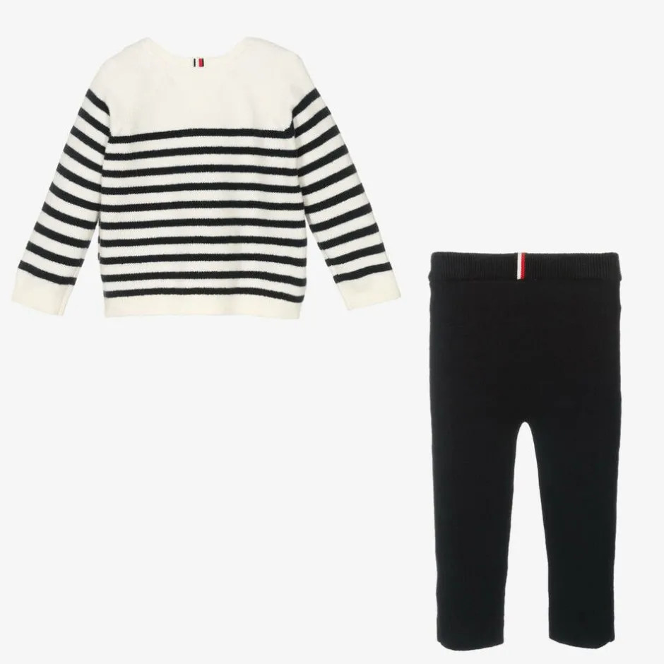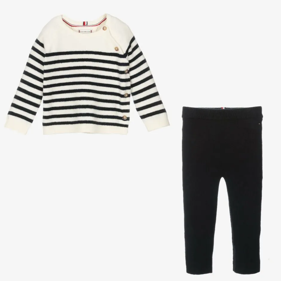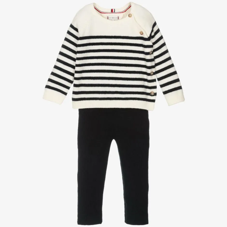 Cosy ivory leggings set for baby boys and girls by Tommy Hilfiger, knitted in a super soft cotton blend. The sweater has navy blue stripes and button fastenings along one side, whilst the trousers have an elasticated waist and simply pull up. Both pieces are embroidered with the brand's signature flag logo.