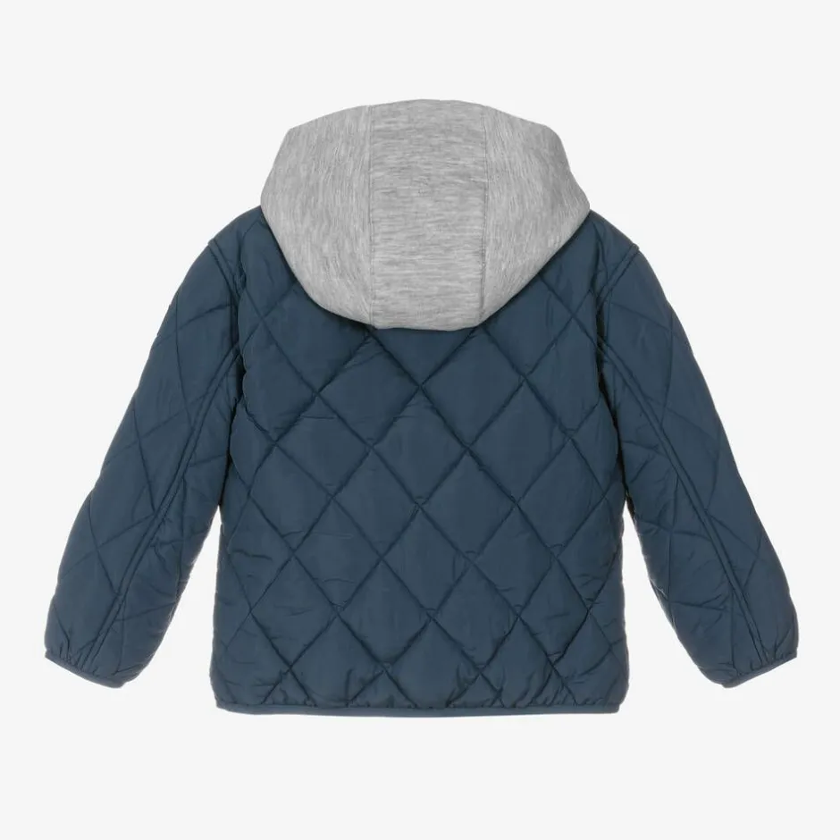 Soft and silky, this navy blue quilted jacket for boys and girls is by American brand Tommy Hilfiger. Ideal for cooler days, it has lightweight padding and a detachable, lined jersey hood in grey marl, secured with buttons. The collar is ribbed, whilst the cuffs and hemline are elasticated for a cosy fit. On the front is the designer's signature embroidered flag logo, as well as two useful patch pockets. It fastens with a front zip and is fully lined in satin for comfort.