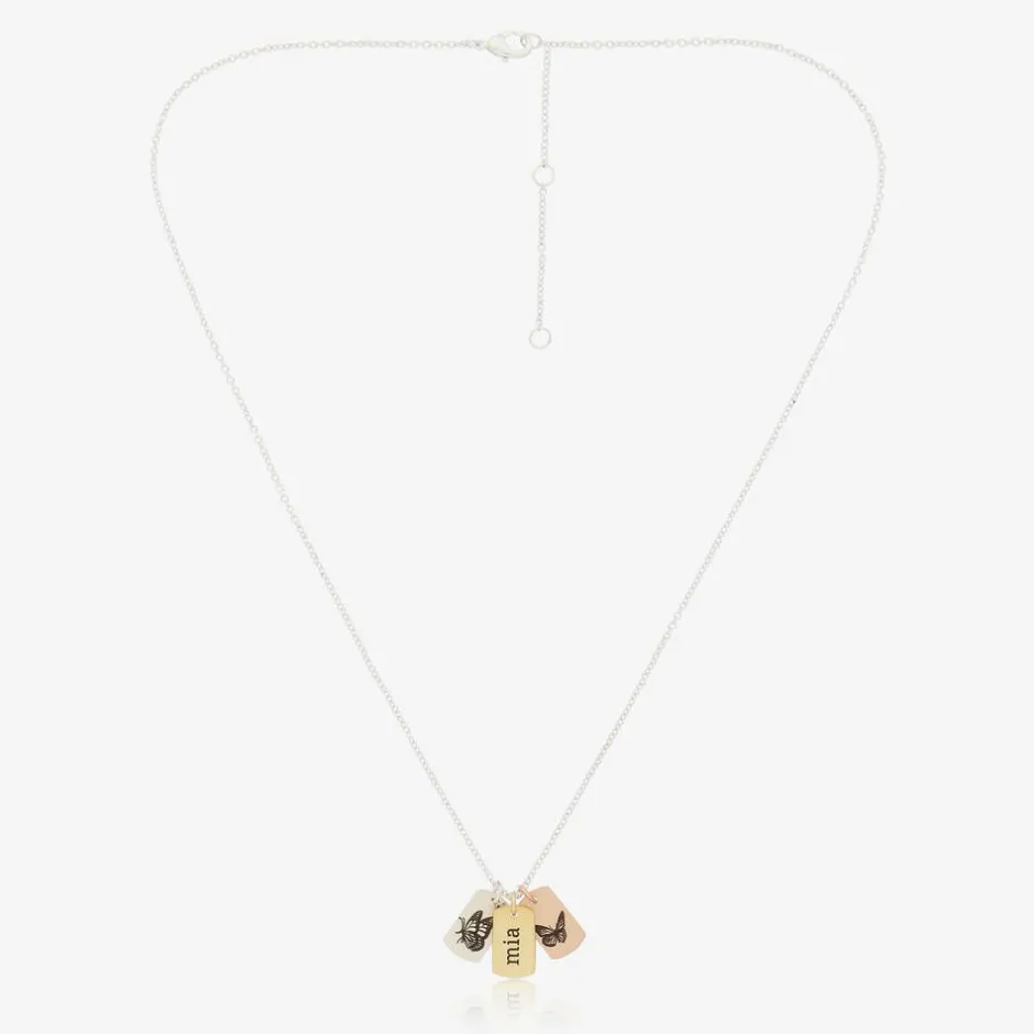 Pretty silver, rose gold and gold-plated necklace for girls by Treat Republic, with a fine adjustable chain for the ideal fit. It has a lovely butterfly tag-style pendant, including a blank tag that can be personalised with their initials. Including all the luxe colours, this accessory makes a versatile, yet thoughtful addition to your little girl's collection.