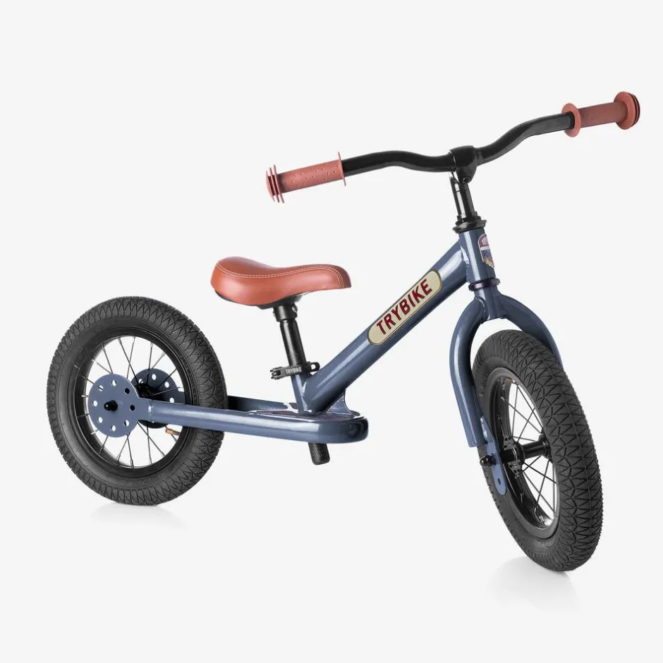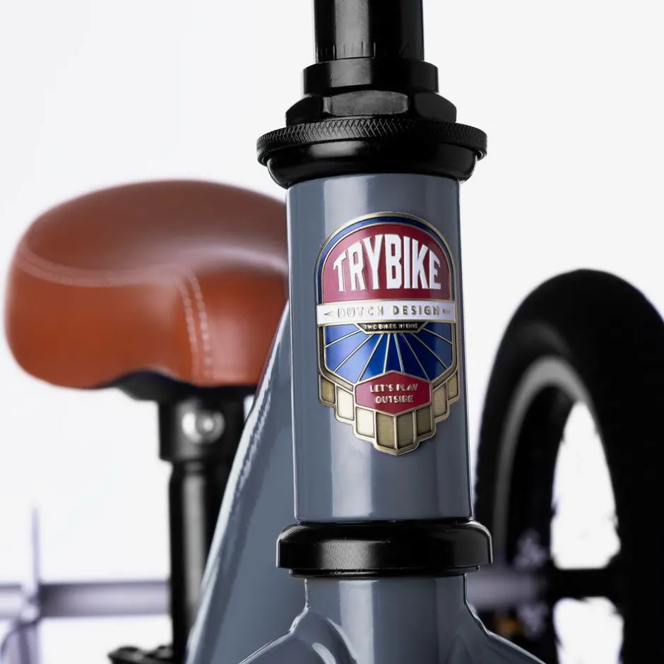 Glossy grey 2-in-1 trike for little boys and girls by Trybike, easily convertible through different stages of their development. It has an adjustable handlebar and saddle for comfort and inflatable 12" wheels for a smooth ride. The handlebars are designed with a unique, small-turning radius to help budding cyclists with easy manoeuvring. As your little one grows, the trike can transform into a balance bike, ideal for children to test out their balance and mobility skills. The frame is customisable with a variety of fun, retro-inspired stickers.