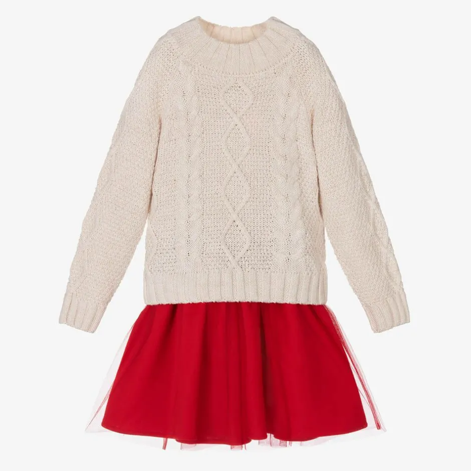 Tutto Piccolo Girls Beige Sweater & Red Tulle Skirt Set Best