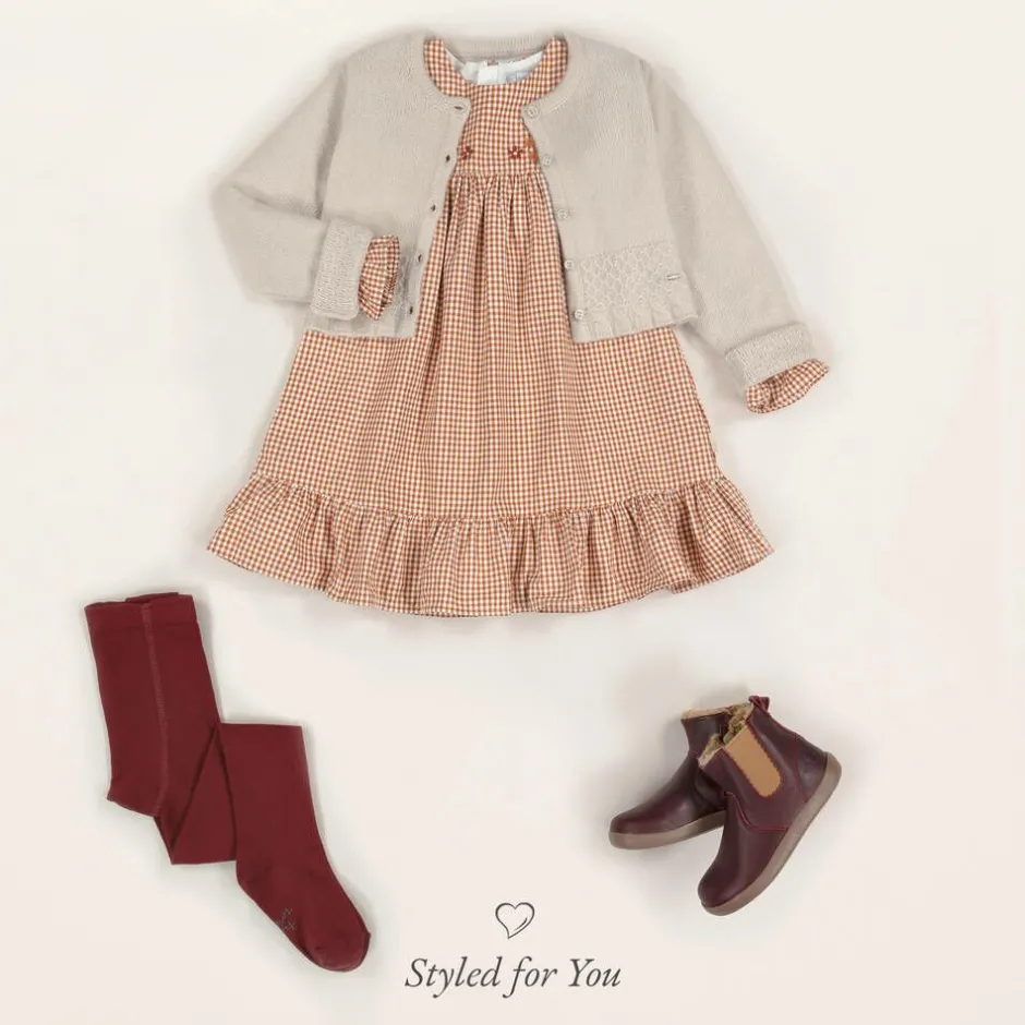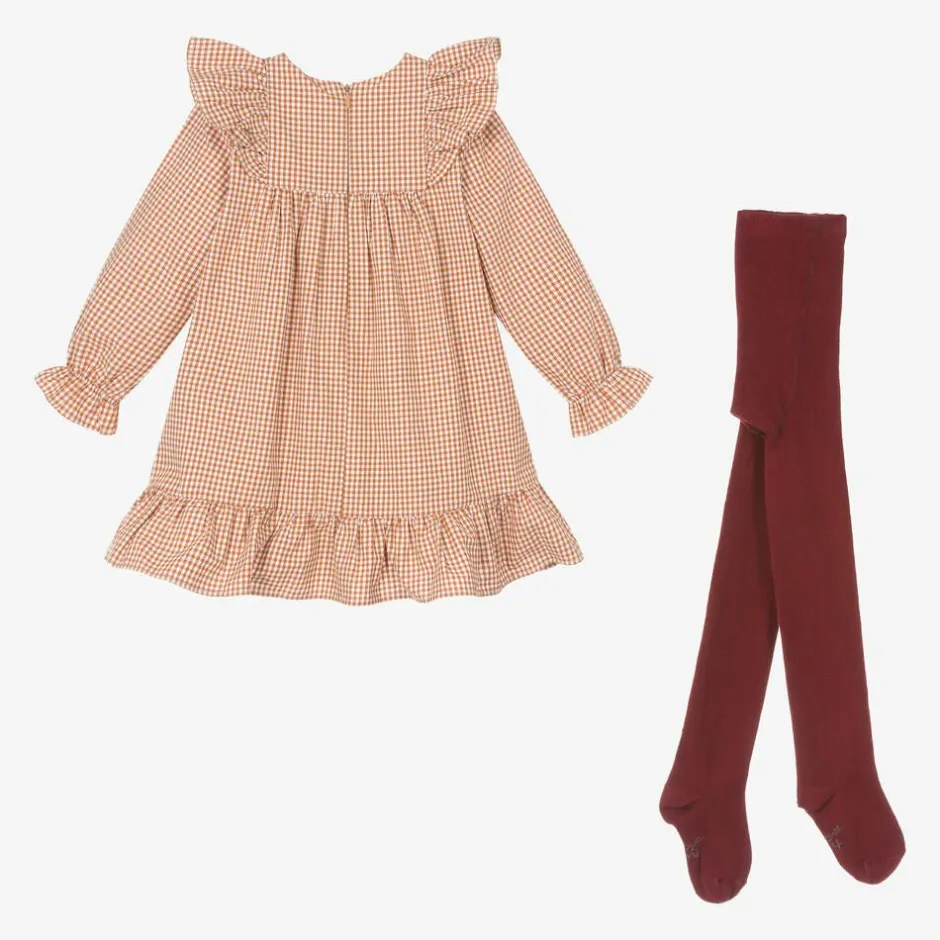 A delightful brown check dress set for girls by Tutto Piccolo. Made from a smooth cotton weave with a lightweight cotton lining, the long-sleeved dress has pretty embroidered flowers on the chest for a charming finish. Fastening with a concealed zip on the back, it has lovely ruffles over the shoulders, a frilled hemline, and elasticated fluted cuffs. The outfit is completed by a pair of burgundy red knitted tights.