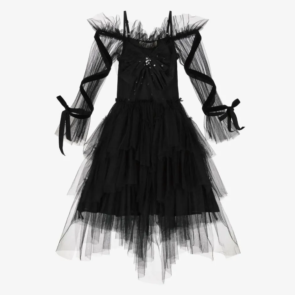 For a stylish, spooky look, this Halloween-inspired black dress for girls is by Tutu du Monde. The fitted jersey bodice features a hand-embellished bow detail and slim adjustable straps. It has an off-shoulder silhouette, with fluted tulle sleeves and velvet ribbons that stylishly lace the arm. The voluminous tutu skirt is made from tiers of gathered tulle which cascade in a zigzag shape for dramatic effect. A soft and lightweight cotton lining adds a comfortable feel. Items are made to last and become more lovely with wear as slight fading and fraying edges add to their charm.