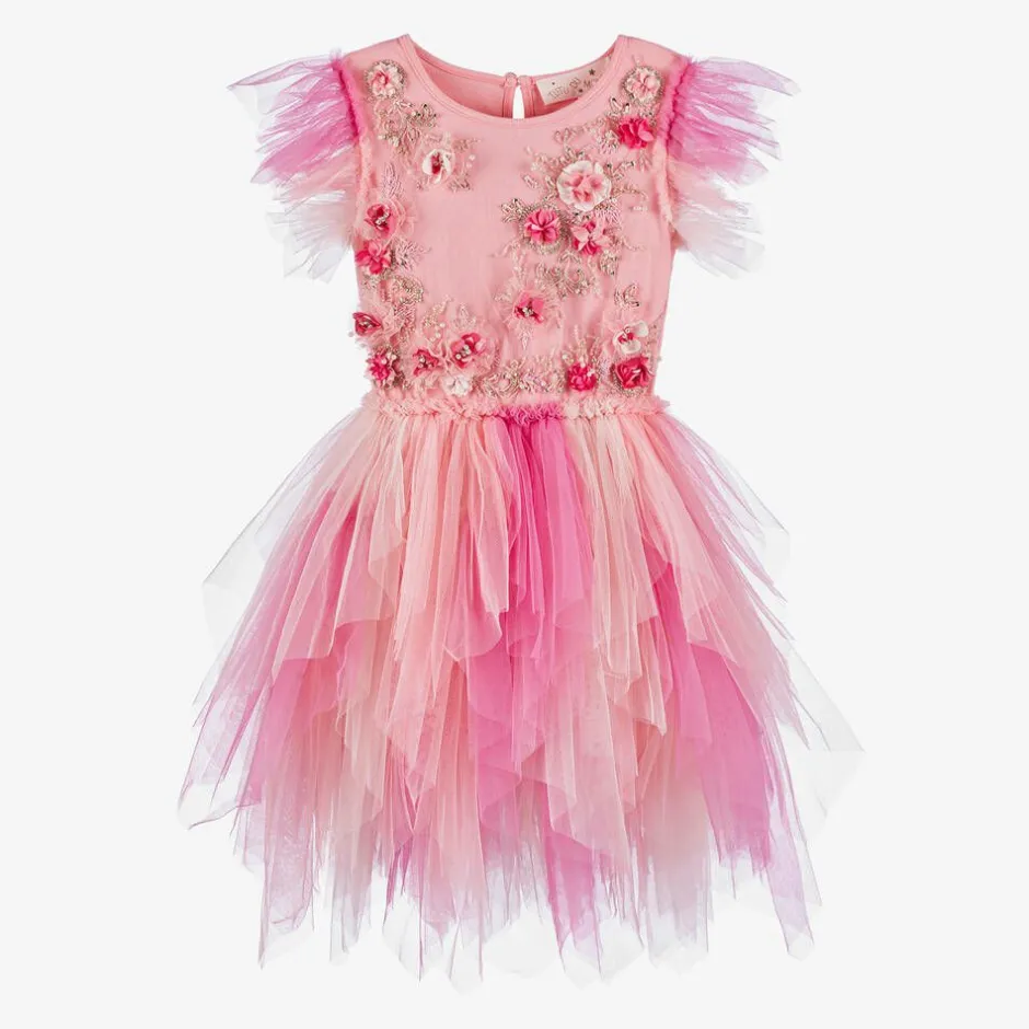 Gorgeous pink Flower Fairy dress for girls by Australian brand Tutu du Monde, ideal for dressing up. The bodice is made in soft cotton jersey. The front is overlaid with a tulle layer, hand-embellished with a beautiful vine and floral motif of sequins, beads and faux pearls. The tri-colour skirt is made in layers of soft tulle, with a feminine handkerchief hem. There are matching tulle ruffles over the shoulders. This stunning dress has a lightweight cotton lining to ensure it hangs perfectly and a single button fastening on the back. Items are made to last and become more lovely with wear as slight fading and fraying edges adds to their charm.