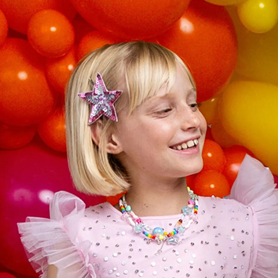 Fun pink and silver hairclips for girls by Tutu du Monde, designed in collaboration with Flour Shop by Amirah Kassem. These star-shaped clips are made in soft felt and covered with disc sequins which sparkle beautifully in the light. The snap clips secure easily and finish off any hairstyle.