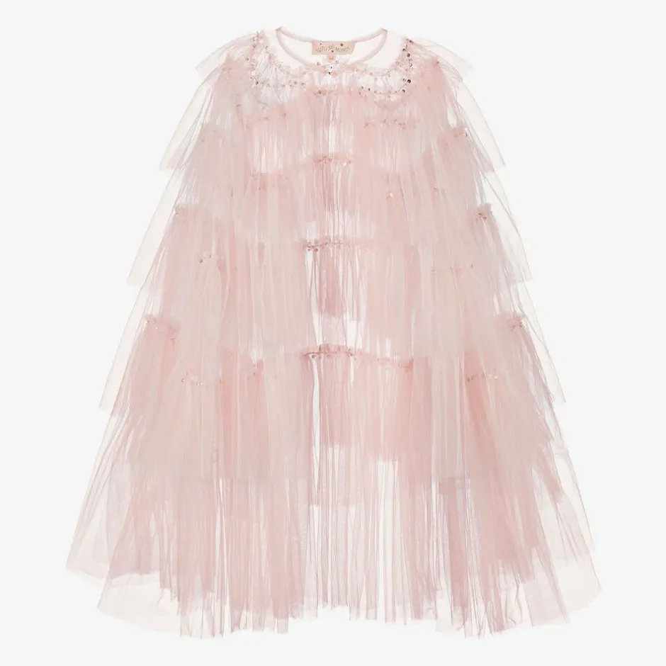 Stunning pink cape for girls from Tutu de Monde, made in soft tulle. Layers of tulle create a beautiful cascading shape to this long cape and silver sequins are placed to peek through the fabric for a touch of sparkle. Items are made to last and become more lovely with wear as slight fading and fraying edges adds to their charm.