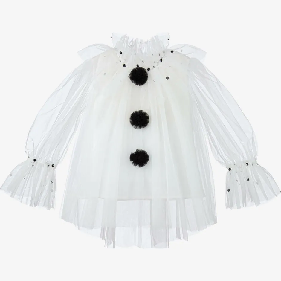 Off-white Harlequin costume top for girls by Tutu du Monde, made from soft and lightweight tulle with a breathable cotton lining. A unique party piece, it has an oversized ruffled collar, sheer puff sleeves, and a keyhole button fastening on the back. The elasticated cuffs and rounded neckline are hand-embellished with silver and black sequins for added sparkle. Black tulle pom-poms on the front complete the circus-inspired look.