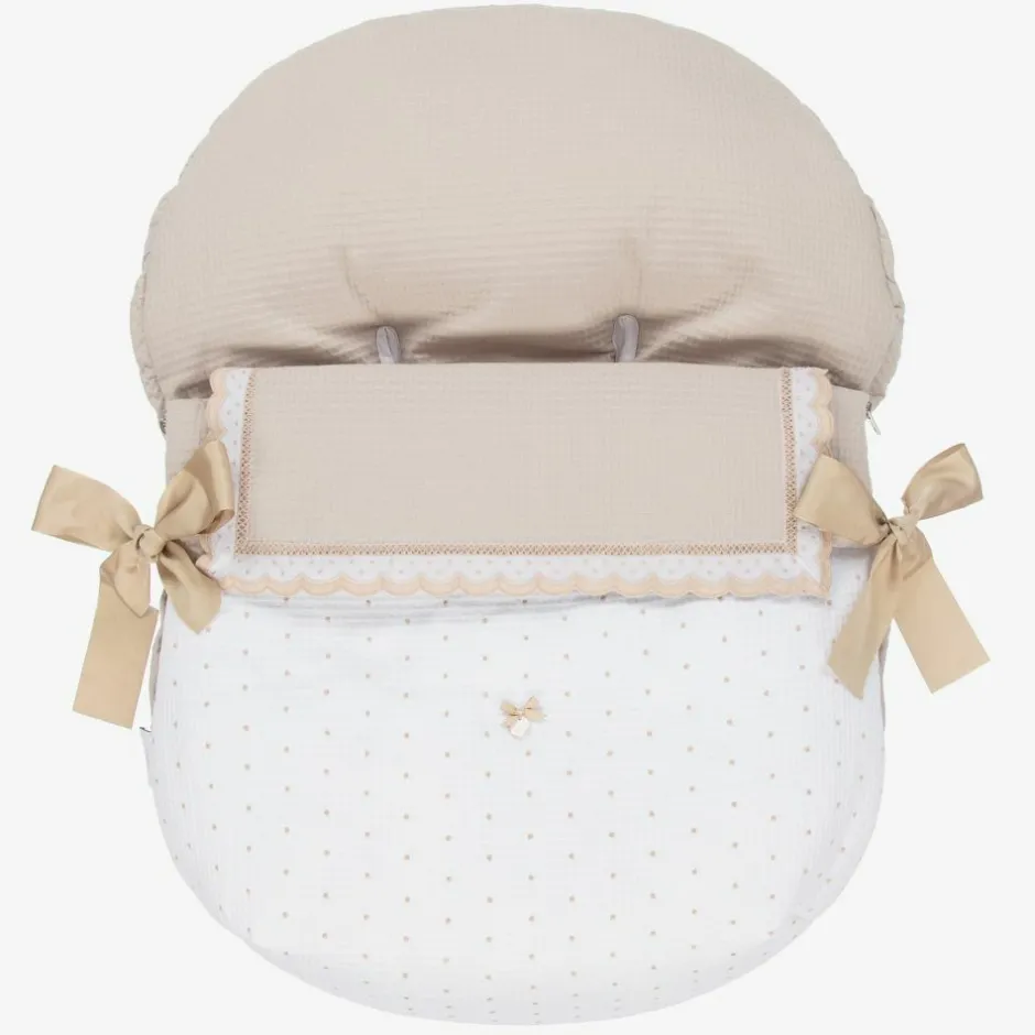Beige and white cotton baby nest by Uzturre, for use in baby car seats. Made in softly padded organic cotton, it has a pretty scalloped trim and grosgrain ribbon ties. There are zip fastenings on both sides for easy access with elasticated cotton backing to hook over the car seat and velcro fastening holes for shoulder straps.