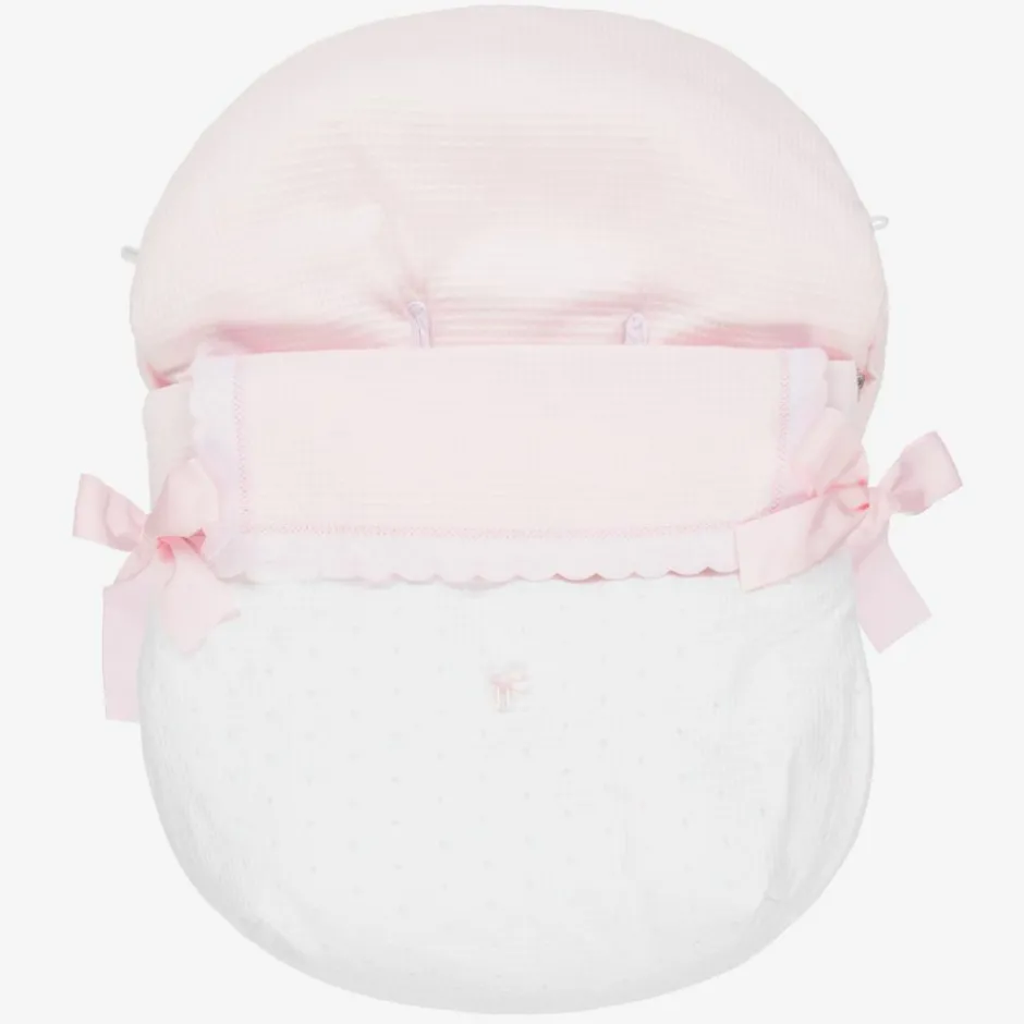 Pink and white cotton baby nest by Uzturre, for use in baby car seats. Made in softly padded organic cotton, it has a pretty scalloped trim and grosgrain ribbon ties. There are zip fastenings on both sides for easy access with elasticated cotton backing to hook over the car seat and velcro fastening holes for shoulder straps.