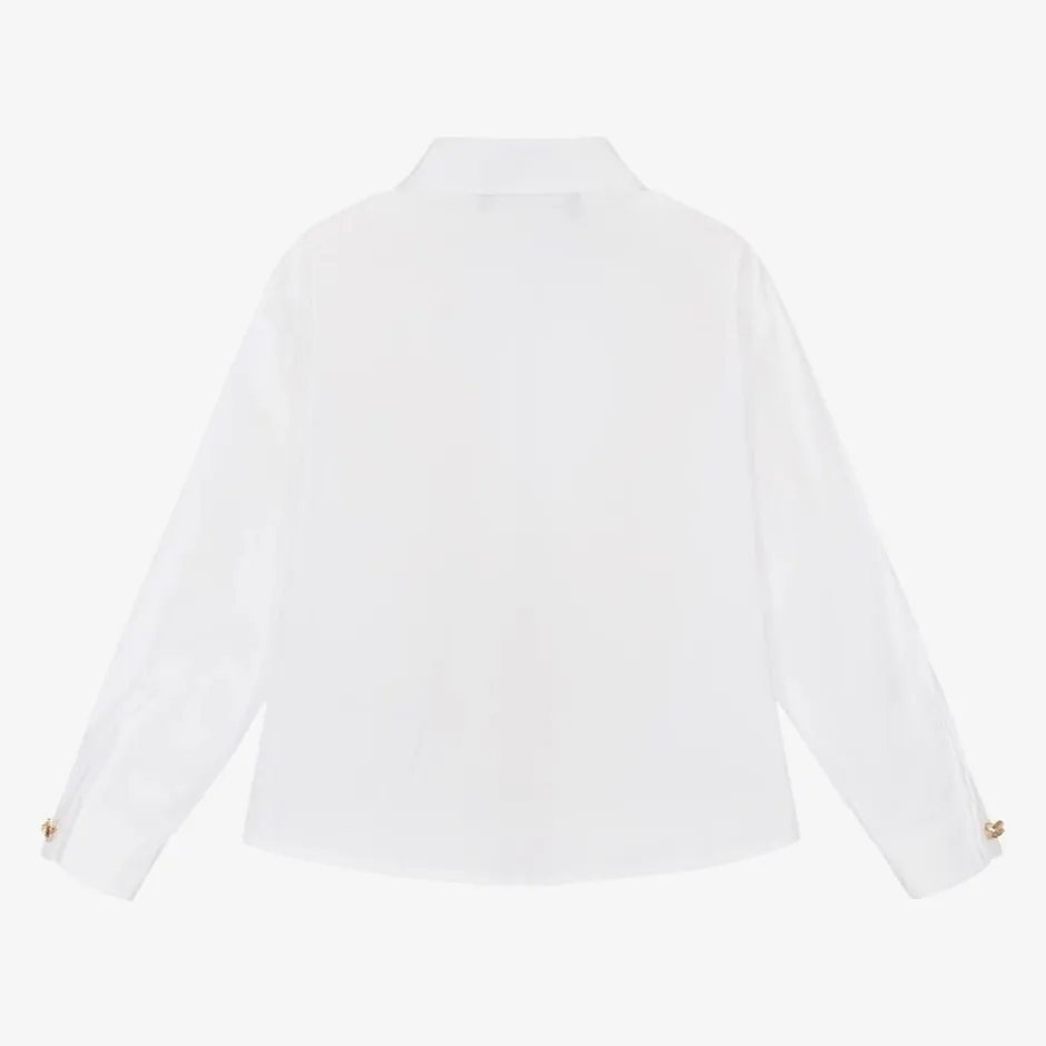 Smart white long-sleeved shirt for baby boys by luxury Italian designer Versace, made in soft cotton poplin. The signature Medusa logo is embroidered in gold on the chest. It buttons up neatly on the front, with shiny gold-tone Medusa accent buttons on the cuffs and below the pointed collar.