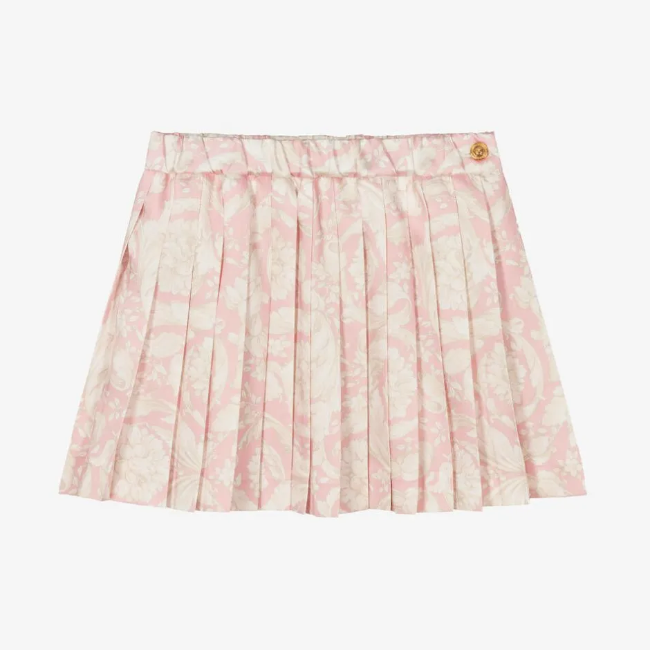 A beautiful pink pleated skirt for baby girls by luxury Italian label Versace, made in silky satin twill. Soft and lightweight, it is printed with the designer's instantly recognisable, signature Barocco pattern in beige and ivory. The waistband is comfortably elasticated and the skirt fastens neatly with a concealed side zip and a gold-tone Medusa button.