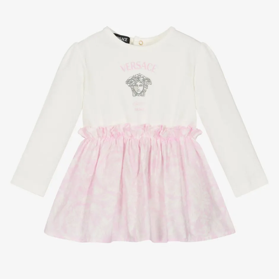 Lovely for baby girls, this pink and off-white cotton dress is by luxury Italian fashion house Versace. The long-sleeved jersey bodice is printed with the designer's iconic Medusa motif and logo on the front. The gathered poplin skirt has a pretty ruffle trim around the elasticated waist, and is patterned in the brand's signature Barocco print in pink and white. The dress fastens with gold-tone branded poppers on the back and comes with matching knickers to complete the look.