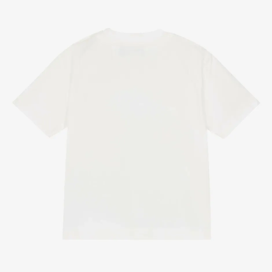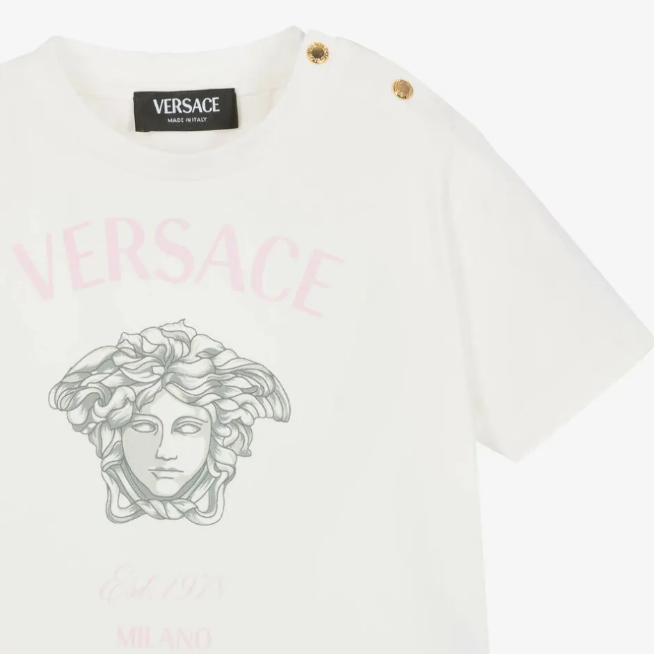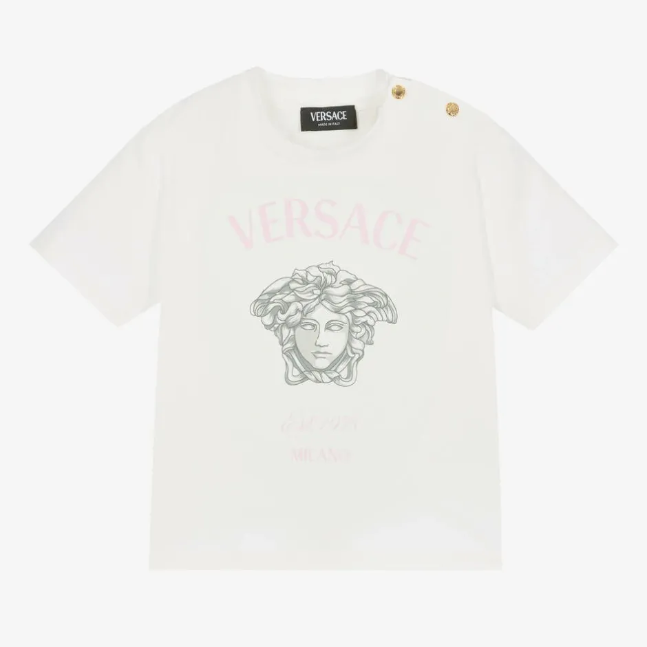 Off-white short-sleeved T-shirt for baby girls by Italian luxury brand Versace. Instantly recognisable, it has the iconic Medusa logo printed on the front, with the designer's name in pink. Made in soft cotton jersey, this casual tee has a crew neckline and gold-tone poppers on one shoulder to assist with dressing.