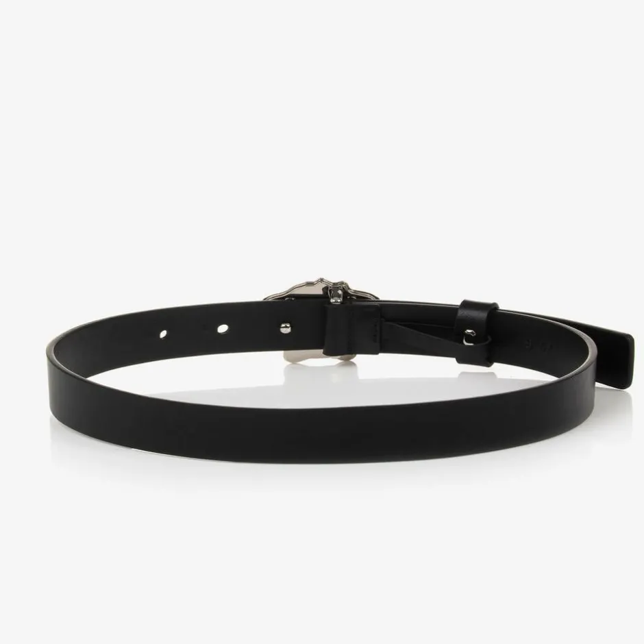 Luxury black belt for boys and girls by Italian designer Versace, made in soft smooth leather. This stylish accessory has a shiny silver metal buckle fastening, shaped in the brand's iconic Medusa logo for an unmistakable designer look.