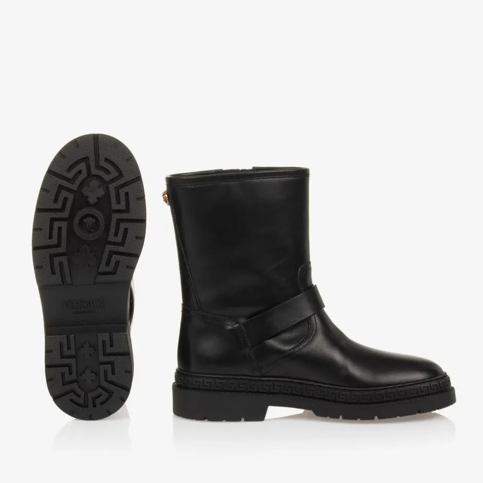 A cool and edgy style from Italian designer Versace, these black leather biker boots for boys and girls are trimmed with gold-hued, branded buckles. Medusa, the luxury brand's icon, is featured on the back and embossed Greca trims the midsole for that unmistakable designer look. The lining and insoles are leather for luxurious comfort and the non-slip outsoles are treaded with the House's well-known codes. The upper buckle can be unfastened to help slip the shoes on.