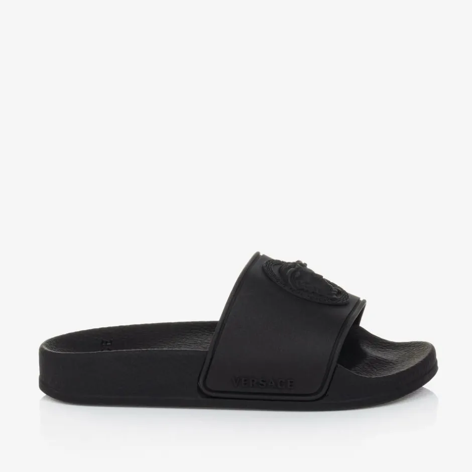 Look cool by the pool in these matte black sliders for boys and girls by luxury Italian designer, Versace. Featuring the iconic Medusa embossed on the front, these soft silicone sliders have a comfortable moulded insole for a great fit. The outer sole is ridged, adding extra grip to this cool resort style.